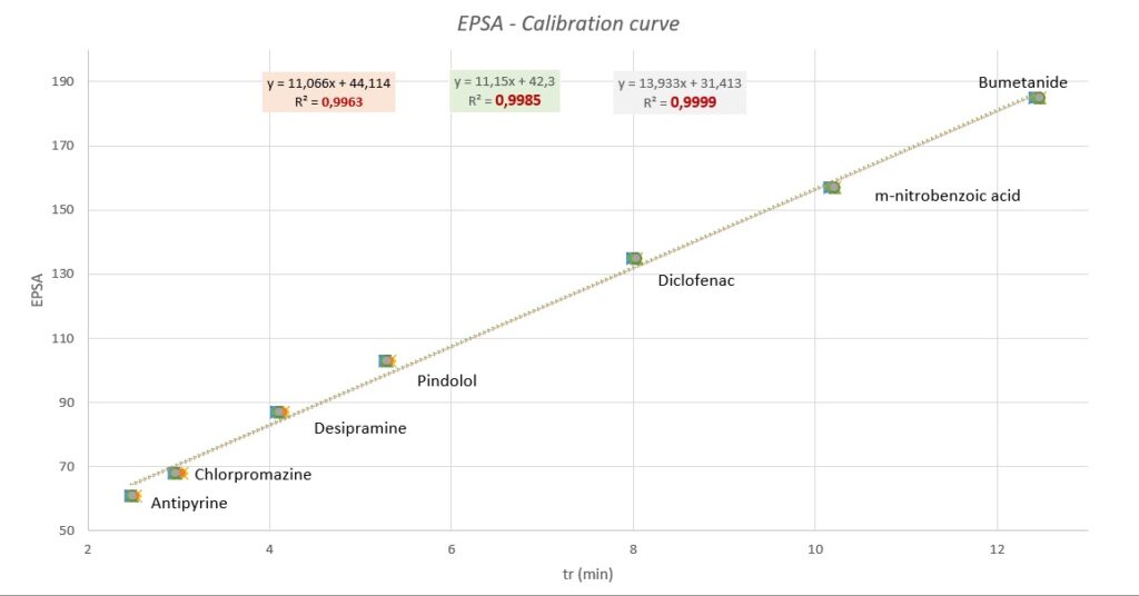 Experimental Polar Surface Area (EPSA) is an experimental value that can be calculated based on the retention time of an analyte on a system calibrated using compounds of known EPSA values.